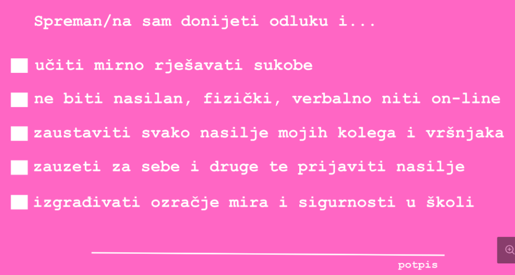 Kartice su potom izložene na zajedničkom panou u hodniku škole kao simbol zajedničke predanosti nenasilju. Vizualni prikaz učeničkih odluka dodatno je osnažio osjećaj zajedništva i poruku da svatko od nas može biti dio pozitivne promjene.